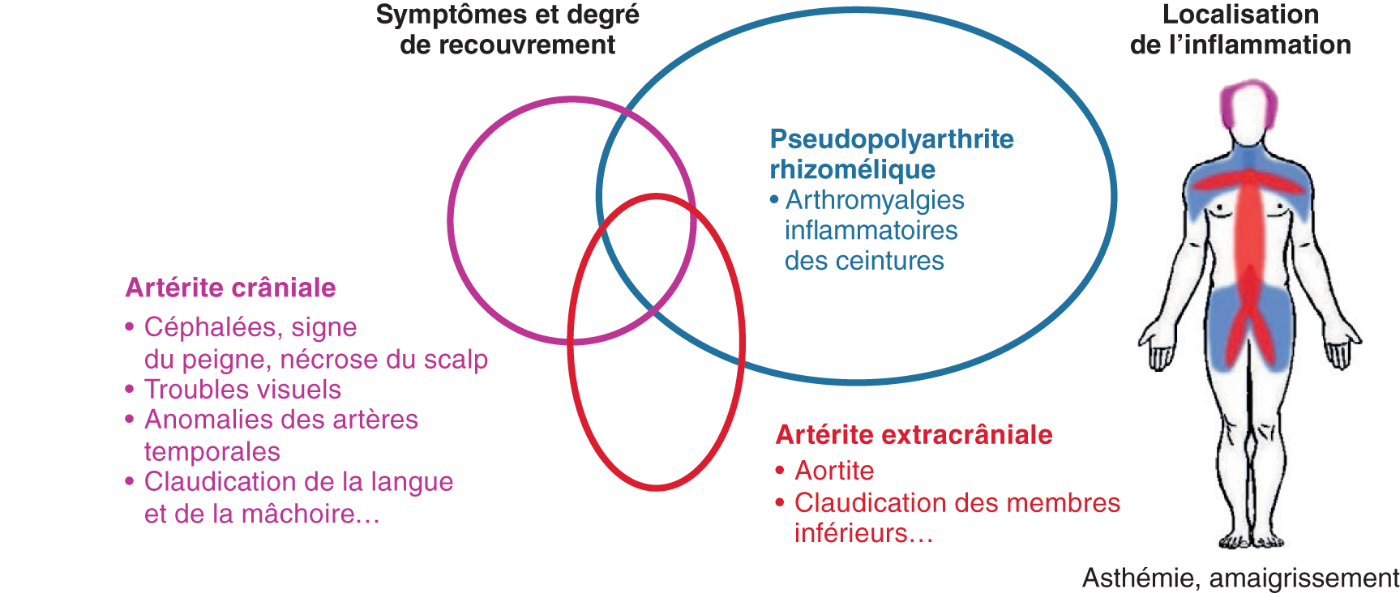 Pseudopolyarthrite rhizomélique (PPR) et artérite à cellules géantes (ACG, ou maladie de Horton) crânienne et extracrânienne.