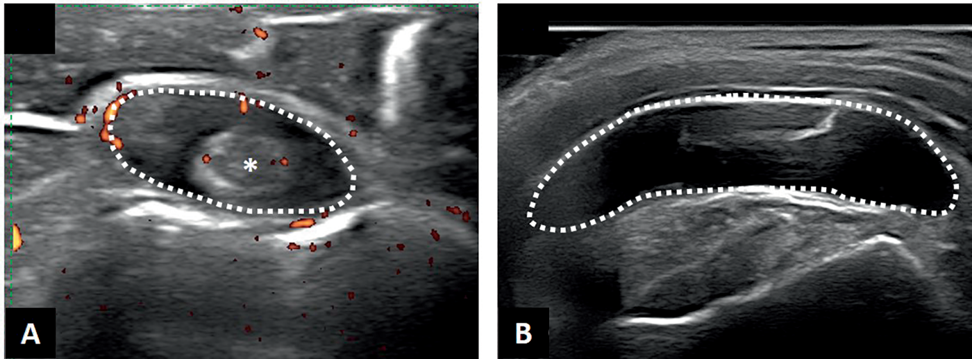 A. Coupe transversale du long biceps (*) montrant une ténosynovite (tirets). B. Bursite sub-acromio-deltoïdienne (tirets).