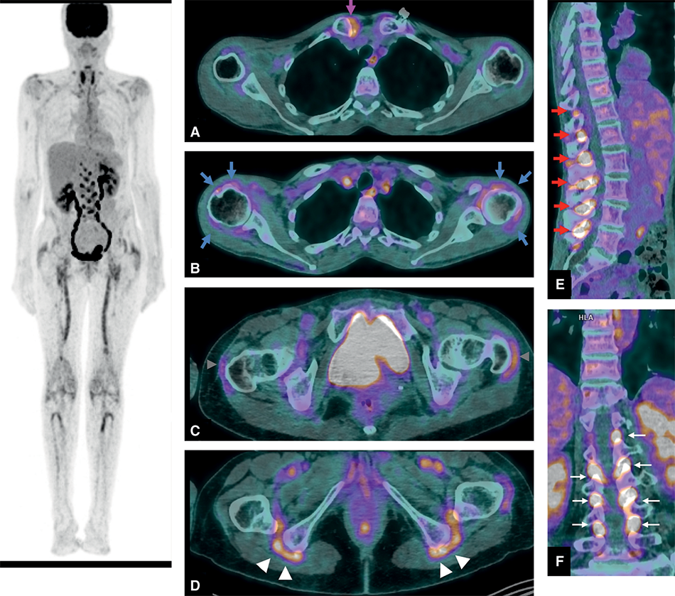 Hypermétabolismes articulaires et péri-articulaires intenses prédominant sur les ceintures et touchant notamment l’articulation acromioclaviculaire droite (A, flèche rose), péri-articulaires des deux épaules (B, flèches bleues), des enthèses sur les grands trochanters (C, têtes de flèches grises) et les tubérosités ischiatiques (D, têtes de flèches blanches) ainsi que des es- paces interépineux (E et F, flèches rouges et blanches). À noter : un hypermétabolisme des artères fémorales, évocateur d’artérite à cellules géantes associée (astérisque).