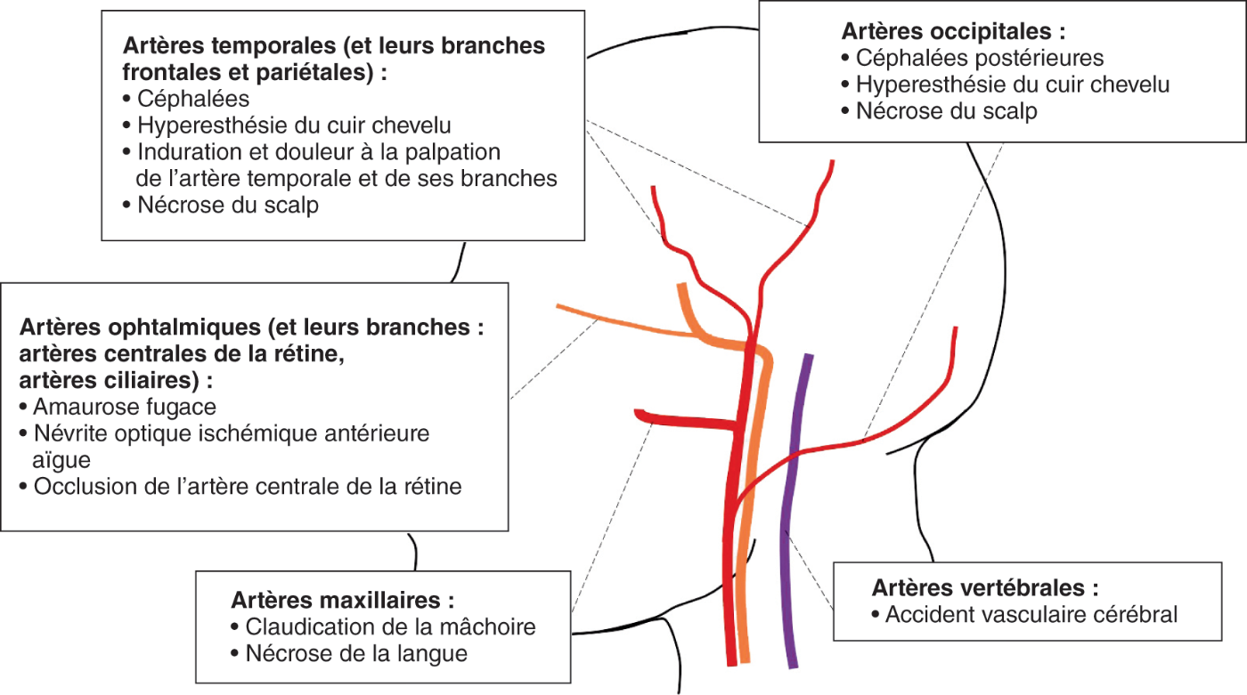 Artères des territoires carotidiens internes (orange), carotidiens externes (rouge) et vertébraux (violet) classiquement atteintes dans l’artérite à cellules géantes et leurs manifestations cliniques associées.