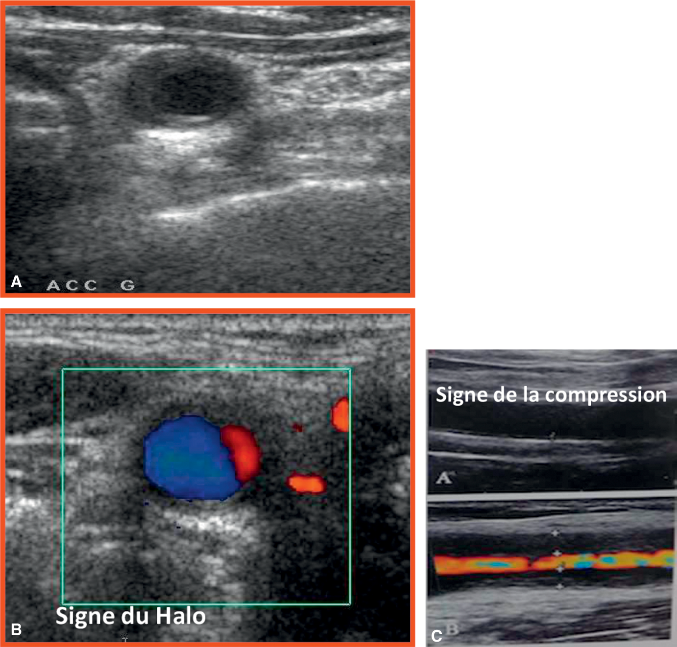 A. Signe du halo en mode B. B. Signe du halo en mode doppler. C. Signe de la compression : en compression, la paroi de l’artère (hypoéchogène) reste visible, sans le flux doppler.
