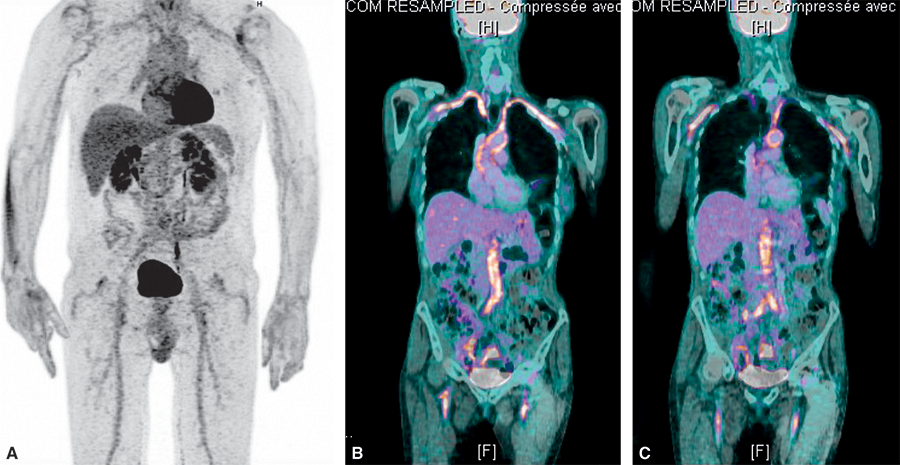 Cet examen au 18FDG, comme dans la PPR, permet de visualiser les atteintes des vais- seaux extracrâniens (fig. 16.7) et d’obtenir une cartographie de l’ensemble des vaisseaux atteints, montrant des zones inflammatoires de fixation intense du traceur radioactif utili- sé. C’est actuellement un des examens de référence dans le diagnostic de l’artérite à cel- lules géantes extracrâniale. Les évolutions techniques rapides de la TEP permettent maintenant d’étudier également les vaisseaux crâniens sur les appareils les plus modernes.