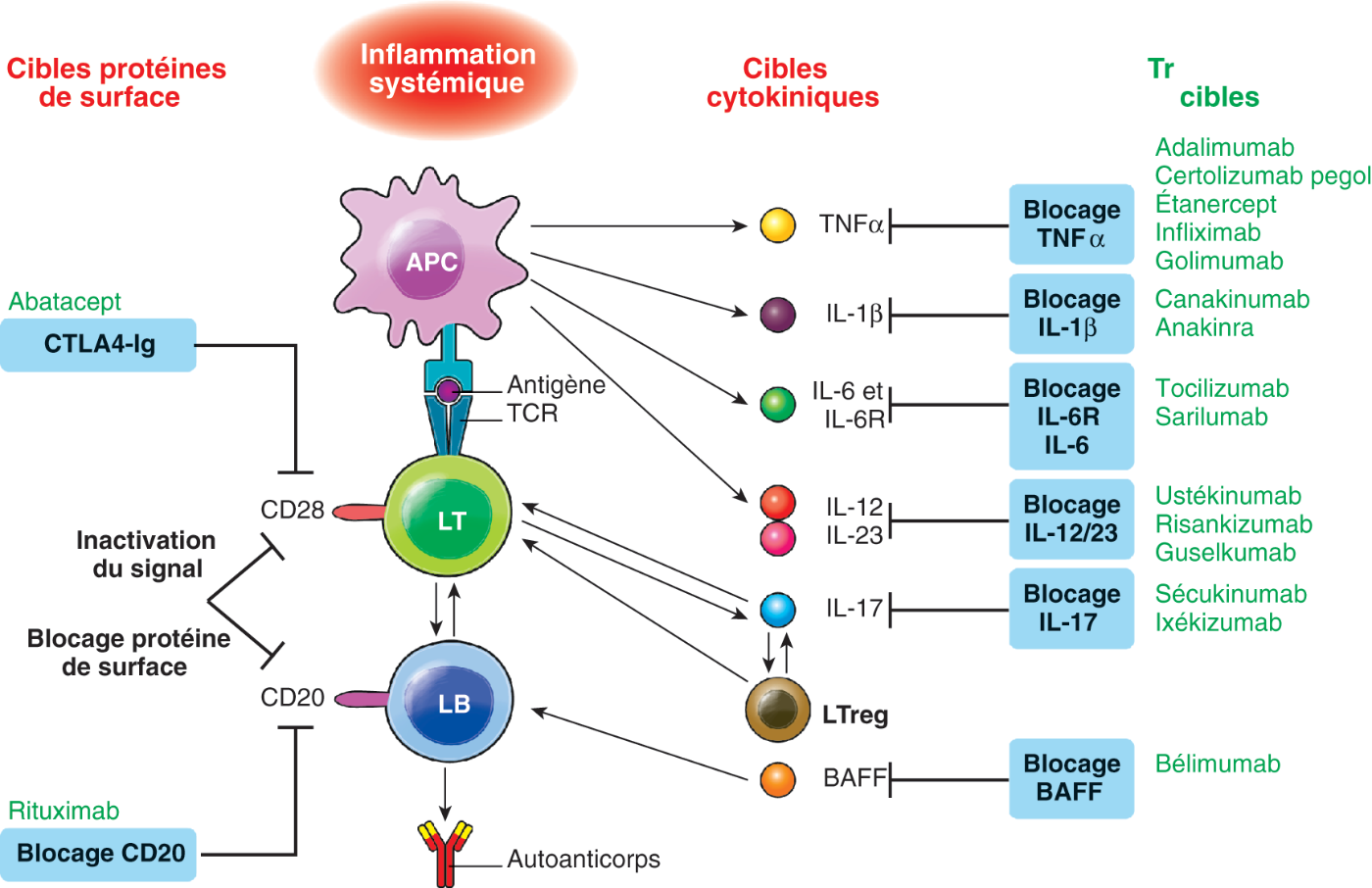 Les cibles des différents biomédicaments sont précisées avec soit neutralisation d'une cytokine soit interaction avec une molécule située à la surface d'une cellule.