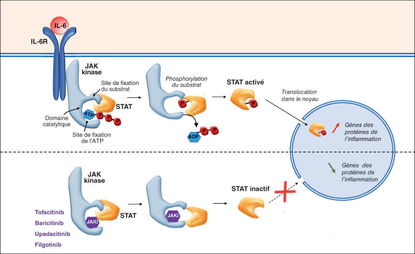 Le JAKi s'insère dans le domaine catalytique de la kinase JAK à la place de l'ATP et empêche ainsi la phosphorylation du facteur de transcription STAT. Le facteur de transcription STAT doit être phosphorylé pour entrer dans le noyau et activer la synthèse de protéines de l'inflammation.