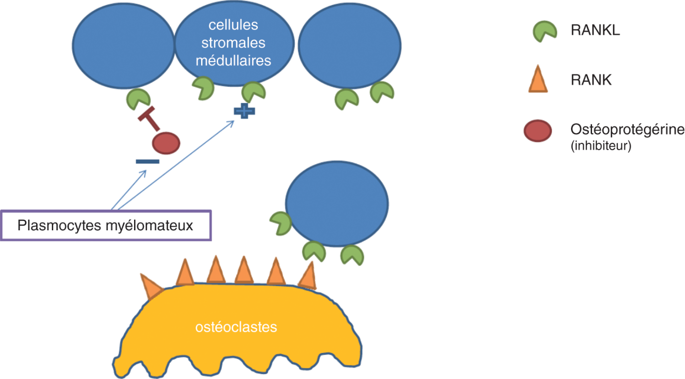 Le plasmocyte myélomateux induit une augmentation de RANKL et une baisse de l’ostéoprotégerine (OPG), régulateur négatif du système. Cela aboutit à la stimulation de l’ostéoclastose.
