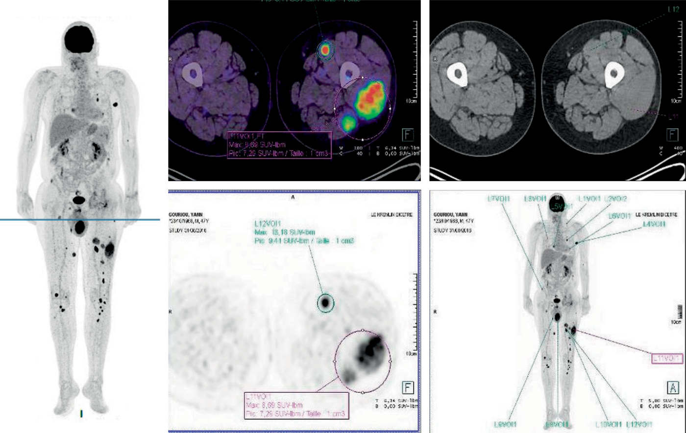 Image « corps entier » d’un TEP-scan. Patient atteint de myélome multiple en rechute sous forme extramédullaire