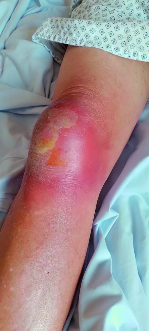 On note une rougeur intense avec une collection sous-cutanée. À noter qu’il n’existe pas de gonflement du cul-de-sac sous-quadricipital n’allant donc pas en faveur d’un épanchement intra-articulaire.